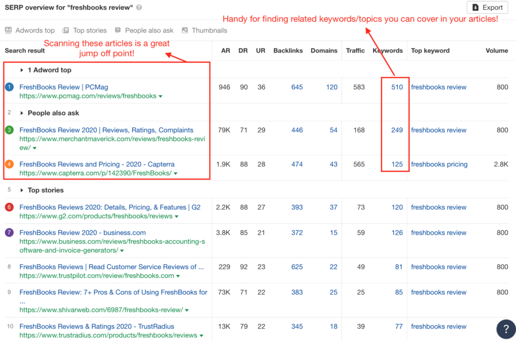- find related keywords and topics to include in my articles (taking cues from the articles currently ranking).
