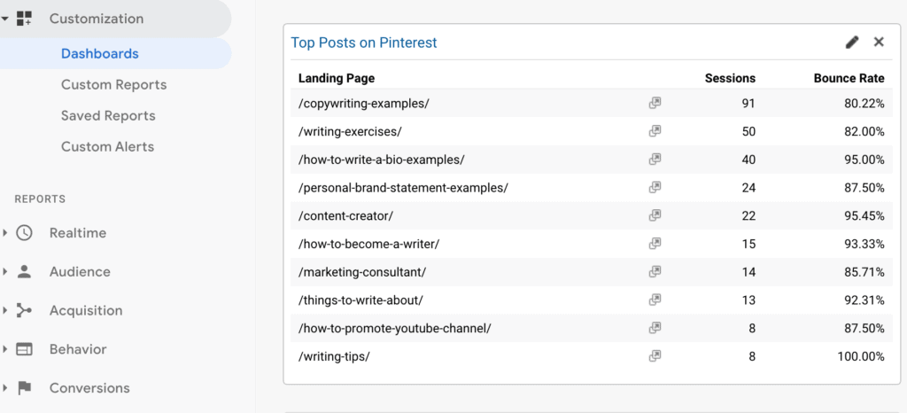 There’s so much data inside GA that you can get overwhelmed. This is why custom dashboards created by other professionals such as this Pinterest Dashboard by Kristie Hill come in handy.