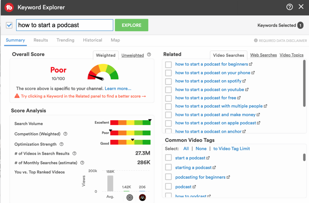 If you’re a video content creator, then YouTube could be a source of evergreen exposure for you — it’s the third biggest search engine in the world after all. TubeBuddy is a top YouTube SEO tool for dissecting the phrases to go after so that you rank in YouTube search. For instance, the keyword below has an overall “Poor” score, so I won’t consider going after it.