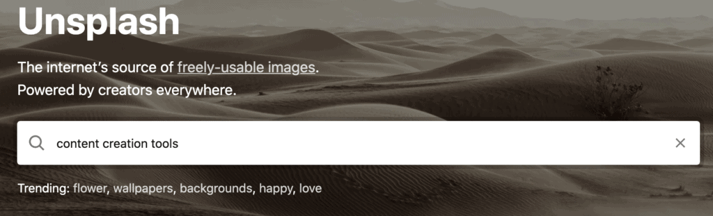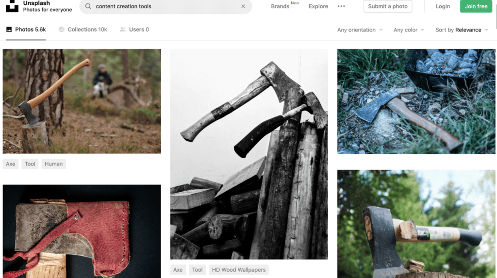 Its library contains millions of free photos, but if you search niche subjects it might not be able to find relevant photos. Try broader search phrases in such a scenario. Here’s a snippet of the photos the platform returned for the term “content creation tools.”