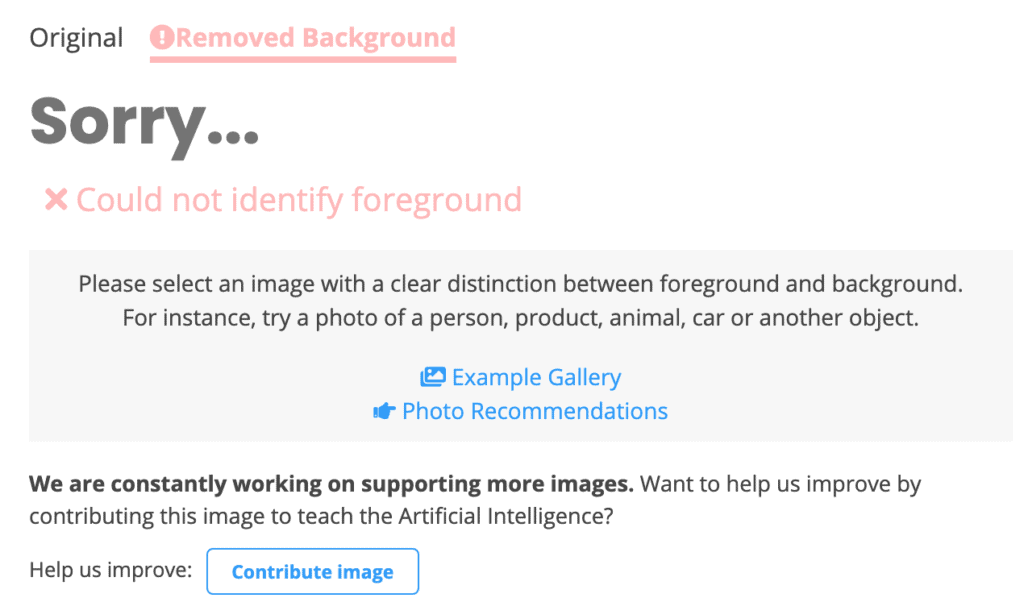 To let the tool whip its magic, you need to have an image of a person, product, animal, or object where it can clearly identify the foreground and background. You can encounter a scenario when Remove.bg fails to make such a distinction.