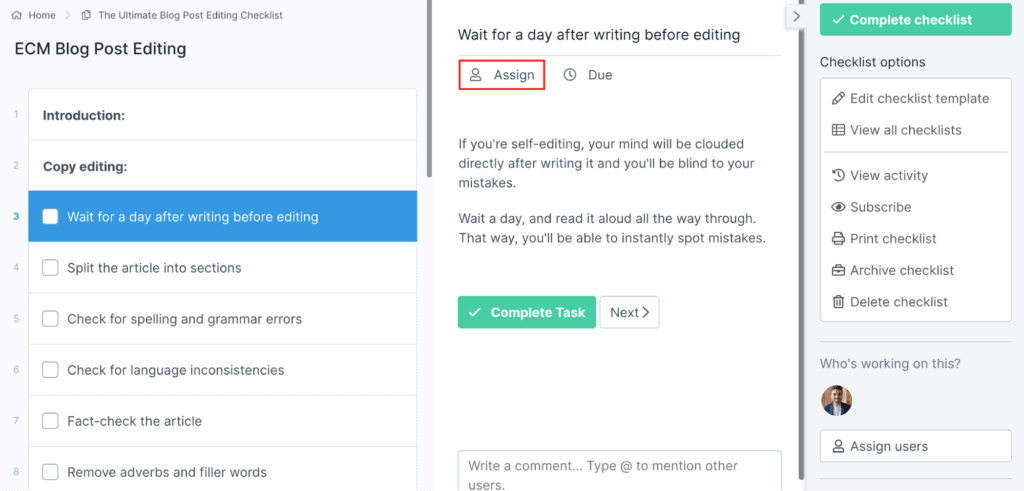 You can create templates for the series of steps in your content creation process for different formats. Then tick off individual items from your checklist, invite team members to assign individual tasks and collaborate with them, and add due dates to ensure you meet deadlines.