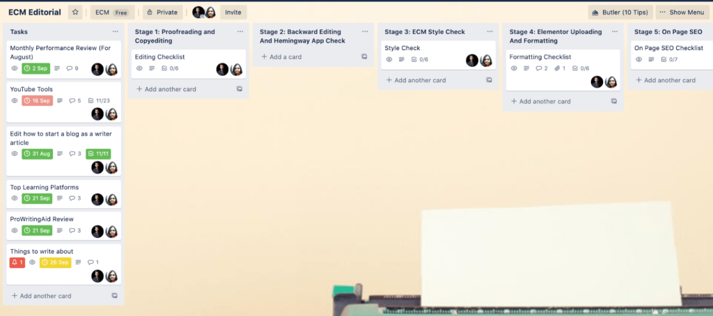 Project management software Trello is handy because your whole team (editor, content manager, designer, SEO, and anyone else) can collaborate using it to put together content. You can discuss specifics of tasks, attach deadlines to tasks, add quality checks, and more.