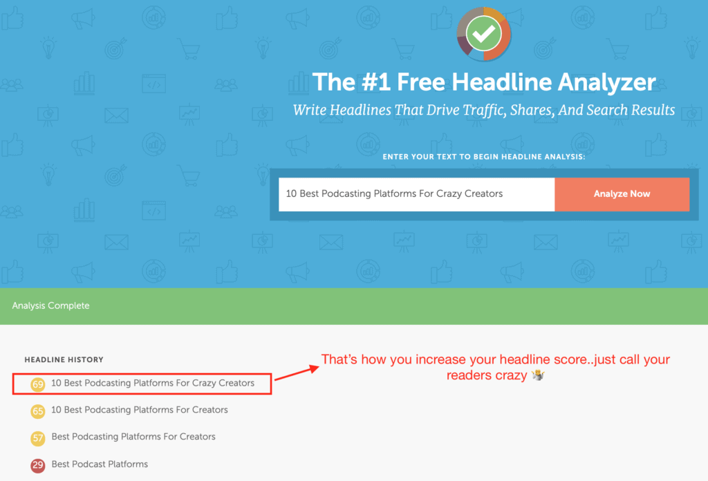 Try different headline variations and try to touch a score of 70. Or hover around 60 when the keyword for your article doesn’t allow creativity (such as “best” software review articles).