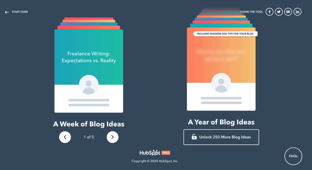 The tool returns a few tiles that can get your juices flowing. If you don’t like the ideas generated, you can “Start Over” and plug new keywords to get more titles. While finding the exact title of your next blog post might not happen with this topic generator, it can lead you to creative angles on popular subjects.
