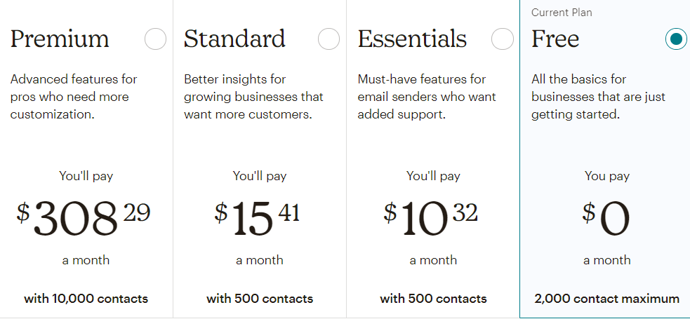 Pricing: Mailchimp offers four different pricing plans — Free, Essentials, Standard, and Premium. Their pricing plan is dependent on your number of contacts.