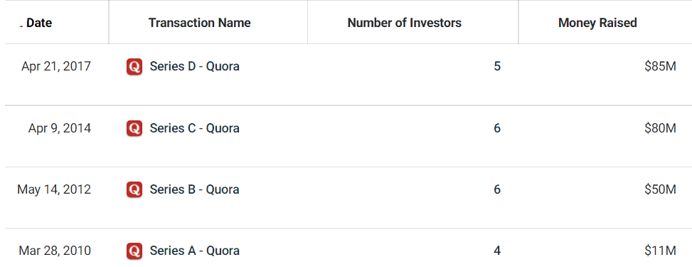 2. Quora has had four funding rounds, of which $85 million was the highest raised in Series D, 2017. (Crunchbase)