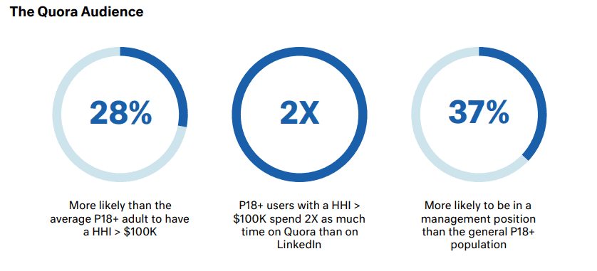 2. In 2018, the Quora audience was 28% more likely than the average adult to have a household income of more than 100k USD per year. (Quora for Business, 2018)