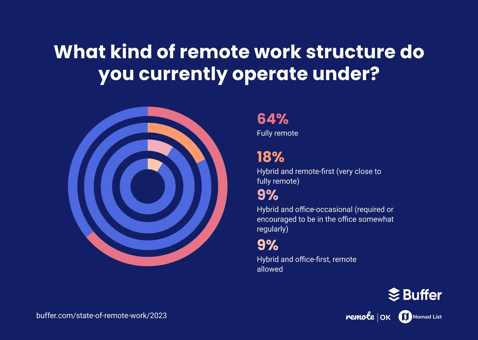 In a study of over 3000 remote workers, 64% are currently fully remote. (Buffer)