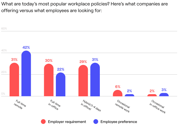 A survey of over 2300 workers found that 42% preferred remote work and 36% preferred hybrid work style, both up from 2021. (Owl Labs)