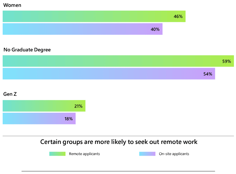4. On LinkedIn, women, Gen Z, and those without a graduate degree are more likely to apply for remote versus on-site positions.