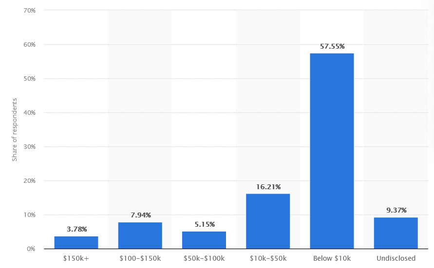 More than 55% of affiliate marketers earn less than $10,000, roughly 16% of affiliate marketers earn up to $50,000, and only about the top 4% of affiliate marketers earn more than $150,000. (Statista)