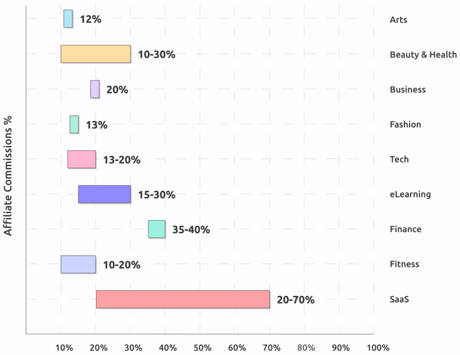 Affiliate marketing commissions averaged between 10-30%. However, SaaS products paid up to 70%. (Influencer Marketing Hub)