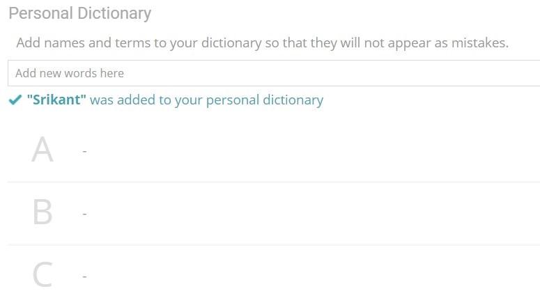 There is no personal dictionary feature, nor a simple dictionary, or a translator available at Grammarly. This can be troubling for non-native English speakers.