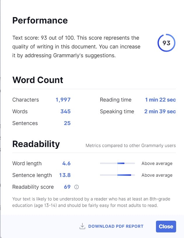 You also get a quick overall report on your writing that is downloadable as a PDF. This can be useful for a short writing analysis for writers of all genre:
