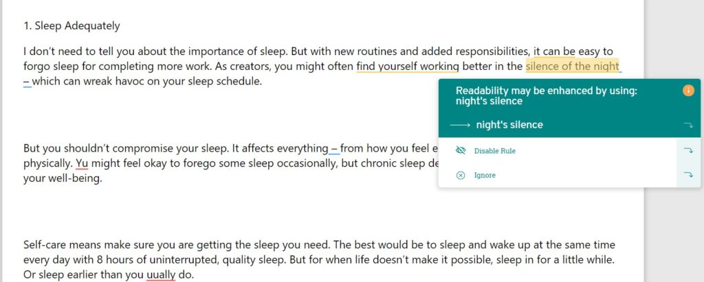 You can also disable this rule, which can be useful for fiction authors’ with regard to the character names in their writing. Clicking on the orange “i” will also tell you more about the particular suggestion provided by the software. This can be useful for non-native English writers.
