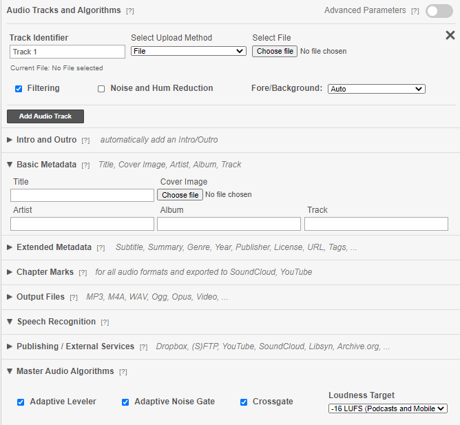 Auphonic was AI-first before “AI” was a marketing term. Upload a file, its algorithm separates voice from music, levels everything, filters noise, and returns a finished master. In 2026, it added speech recognition via multiple backends (Whisper, Google, Amazon, Speechmatics) for transcripts and automatic chapter marks.