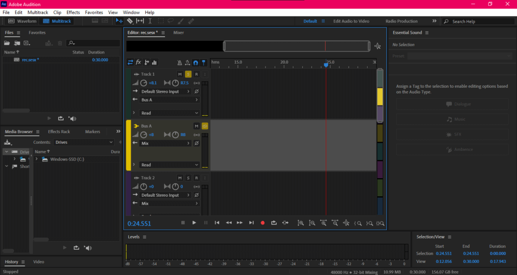 Audition is the full professional DAW. Multitrack editing, spectral frequency display, batch processing, podcast-specific voice processing plugins, and direct integration with Premiere Pro for video podcasts. It’s now also where Adobe’s AI speech enhancement lives as an in-app effect, same model as the free Adobe Podcast tool, but applied non-destructively.