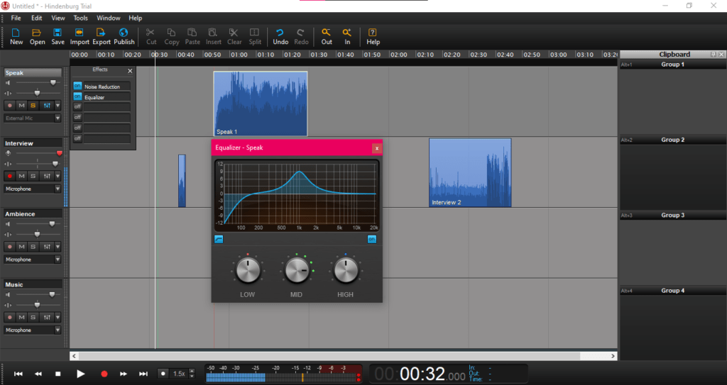 Hindenburg rebranded Journalist into “Pro” and consolidated its tiers. It’s still the DAW built specifically for spoken-word, narrative podcasts, journalism, radio docs. Auto-leveling, a clipboard to organize clips into a storyline, voice profiler for EQ, and direct publishing integrations.