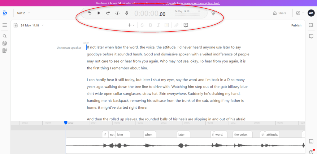 You can double-tap any word to play your media from that specific word, search for keywords with its find and replace feature, mark important words or quotes with a highlighting tool, use tab as a shortcut to play and pause the audio and utilize the enter key to add a speaker.