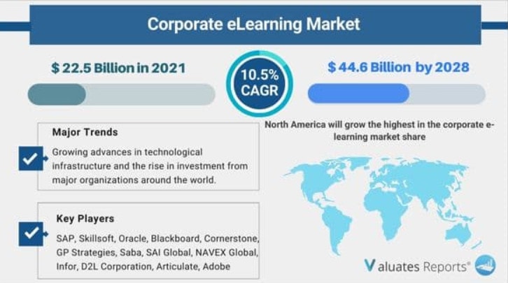 1. The corporate digital learning market is expected to reach $44.6 billion by 2028 with a CAGR of 10.5% from its valuation of $22.5 billion in 2021. (Valuates Reports)