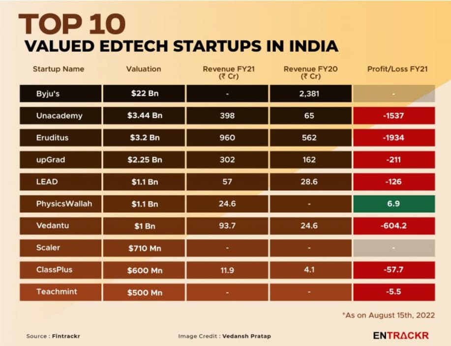6. Edtech unicorn Byju’s was the largest Edtech company in India with a $22 billion valuation. (Entracker)