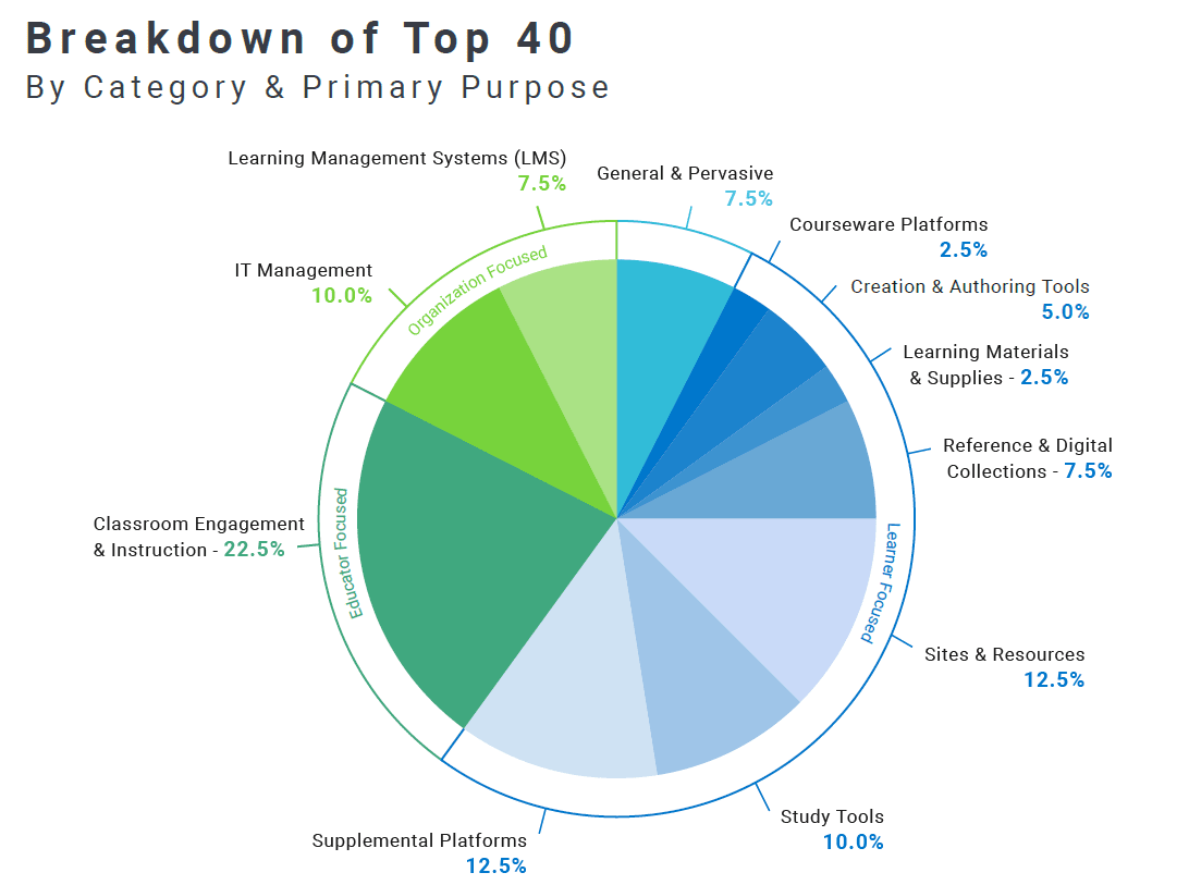 6. According to a survey of over 2.9 million students in K-12 systems, classroom instruction, and engagement tools (22.5%) are the highest used as compared to other categories like learning management systems (LMS), IT management, Study tools, Sites, and Resources, among others. (Learn Platform)