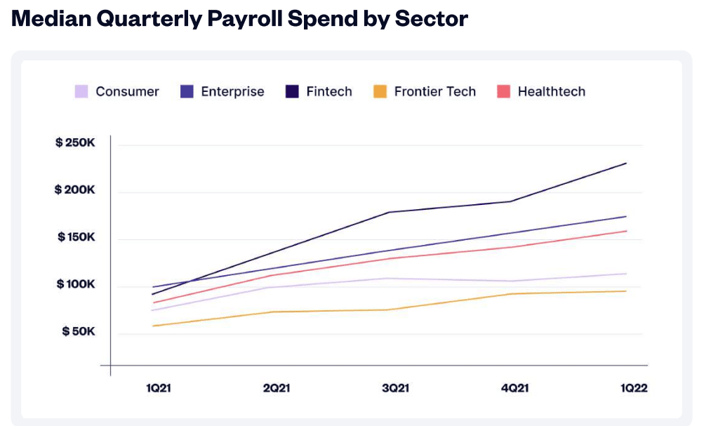 2. Fintech had the highest median quarterly payroll spend of nearly $250k. (AngelList)