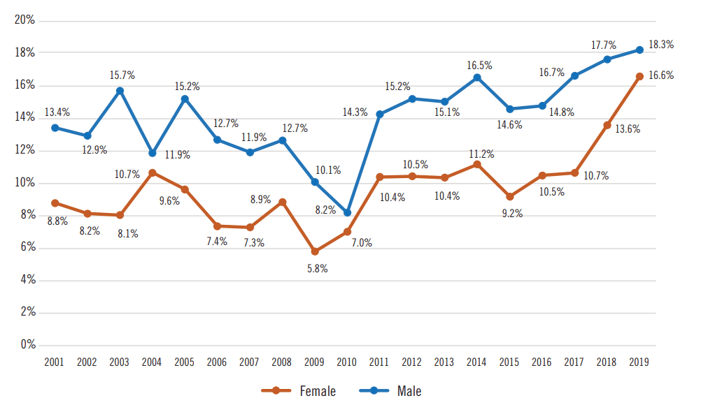 3. The graph below shows total entrepreneurial activity by gender in the US adult population between 18-64 Years of Age. (Babson College)