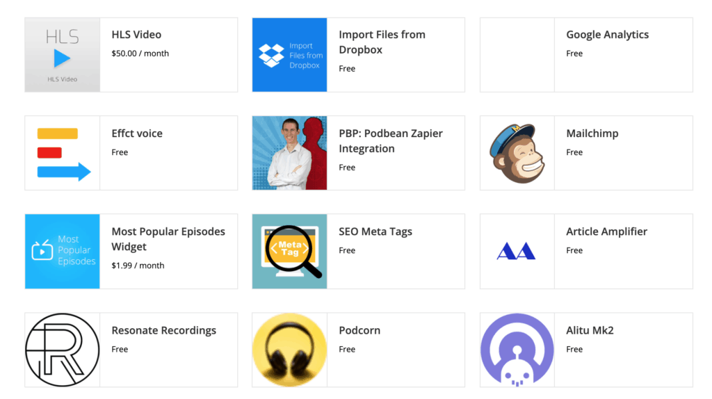 Beyond uploading and publishing tools, you get a few free customizable theme templates. Alike WordPress, there are Podbean plugins to add functionality to your podcast website — such as importing files from Dropbox to the Podbean Media manager, sending email subscribers updates about your show, managing SEO meta data of your episodes, and more.