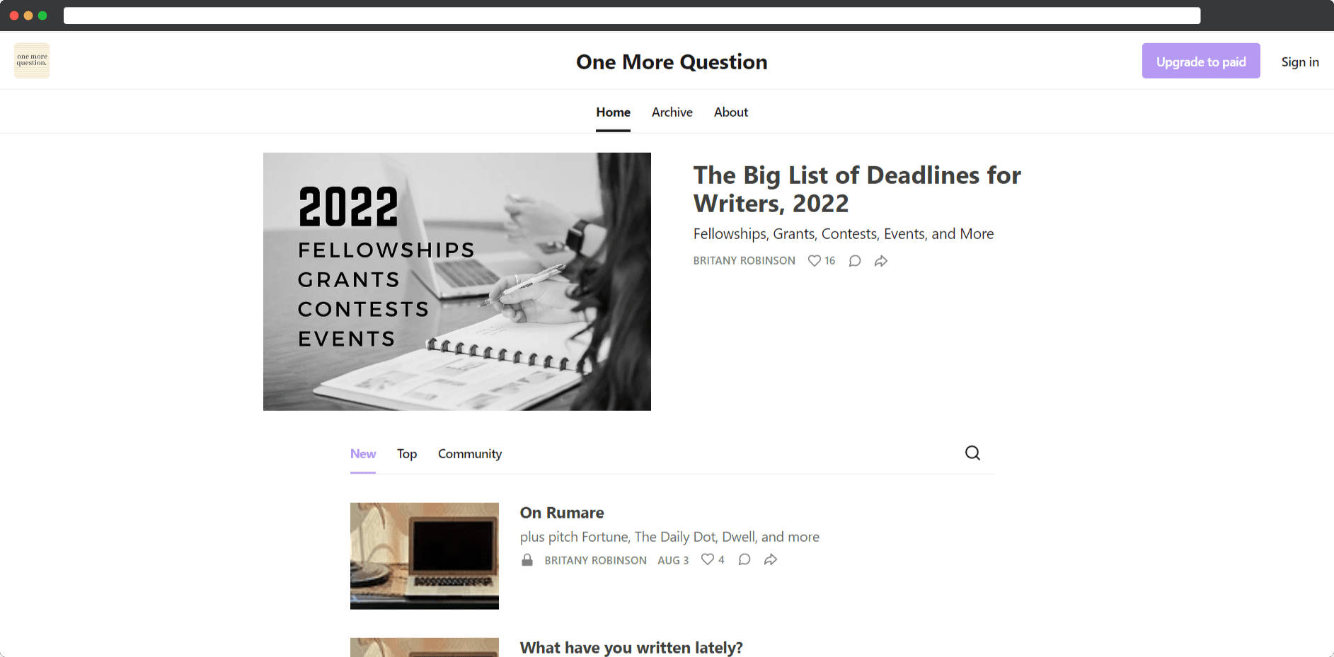 In the paid version, she shares some contests, grants, fellowships, and pitching opportunities She also shares her own and other freelancers’ advice on essays on writing, pitching, and publishing.