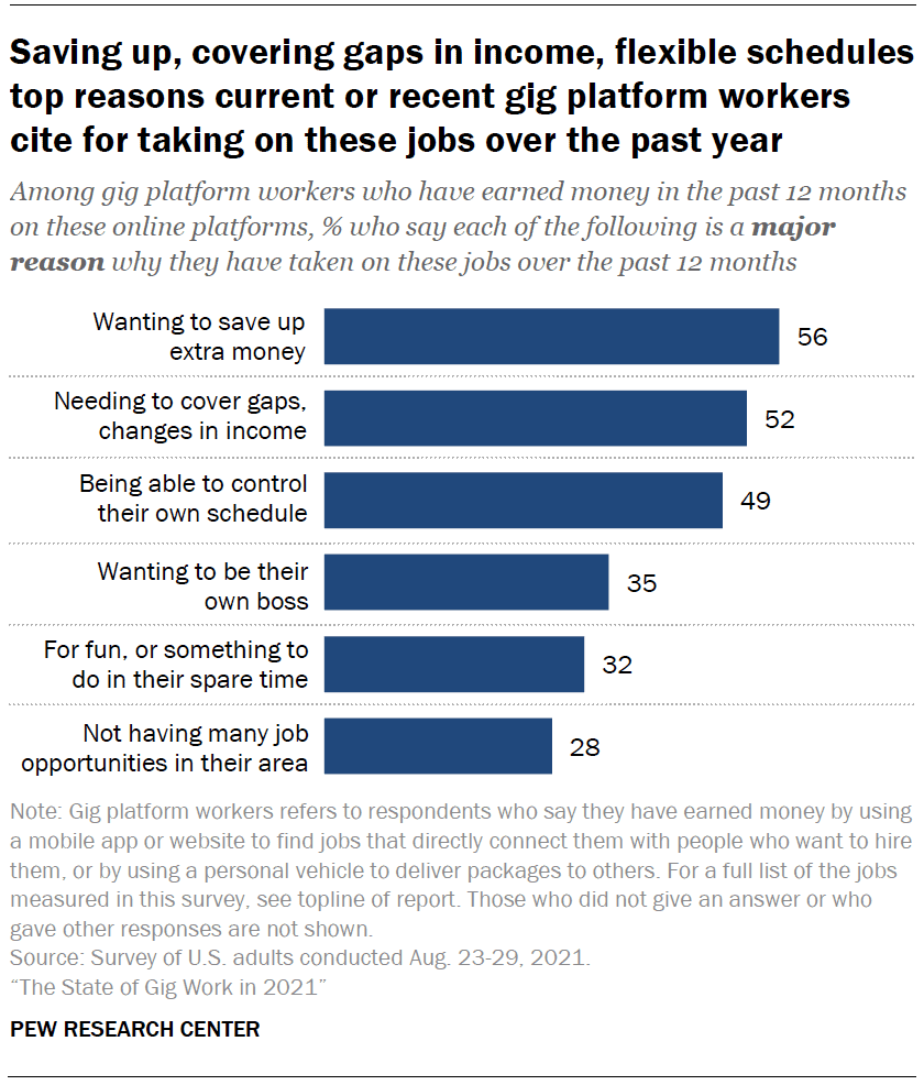 3. Finances and job flexibility are the key reasons people turned to gig platform work, as per a recent survey. (Pew Research Center)