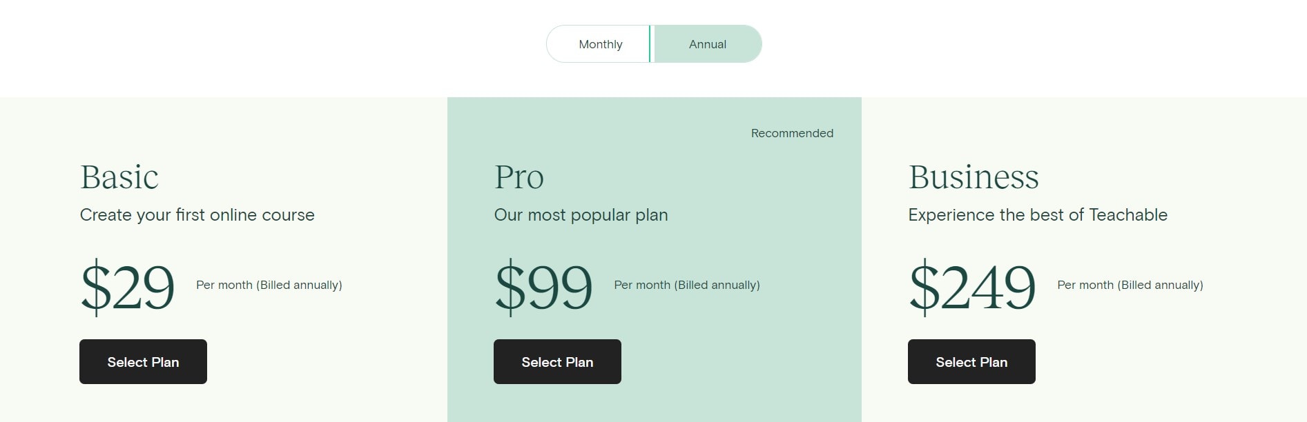 Teachable, on the other hand, has cheaper plans. Their lowest-tier plan only costs you $29/month. Similar to Kajabi, they’re discounted for annual billing and offer a 14-day free trial.