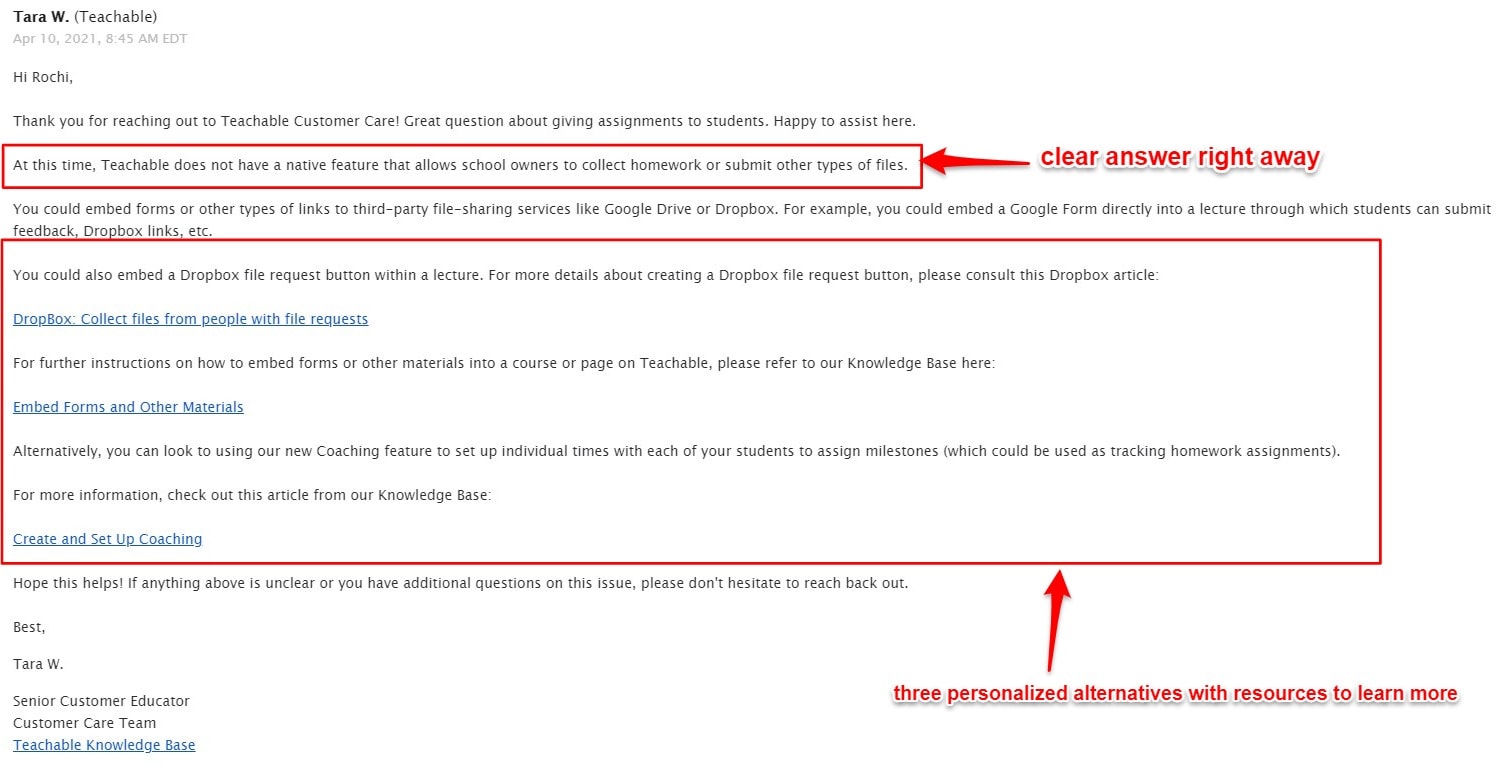 When I reached out to Teachable’s service, the response was personalized and helpful. I liked how the response was tailored to my request and not a templated solution. The agent also redirected me to other helpful resources.