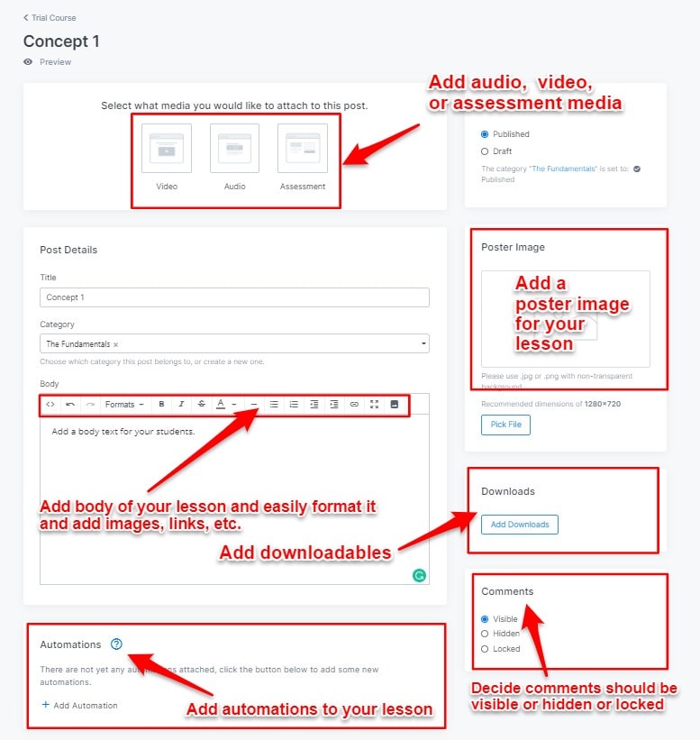 Kajabi’s course-builder is a simple drag-and-drop. You can do a bulk upload of your content and organize them into neat categories for your course. The platform is simple to use. But you cannot add two types of multimedia or a zoom link in your lesson.