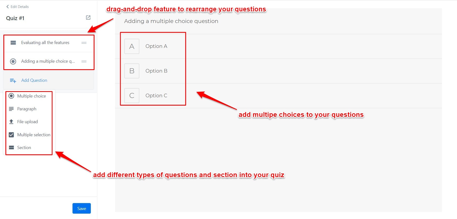 At Kajabi, you can create quizzes of different kinds: multiple-choice, paragraph-style, etc. You can choose to automatically grade your students and set a passing grade too. You can also upload images on your questions and do marketing surveys through these questions.