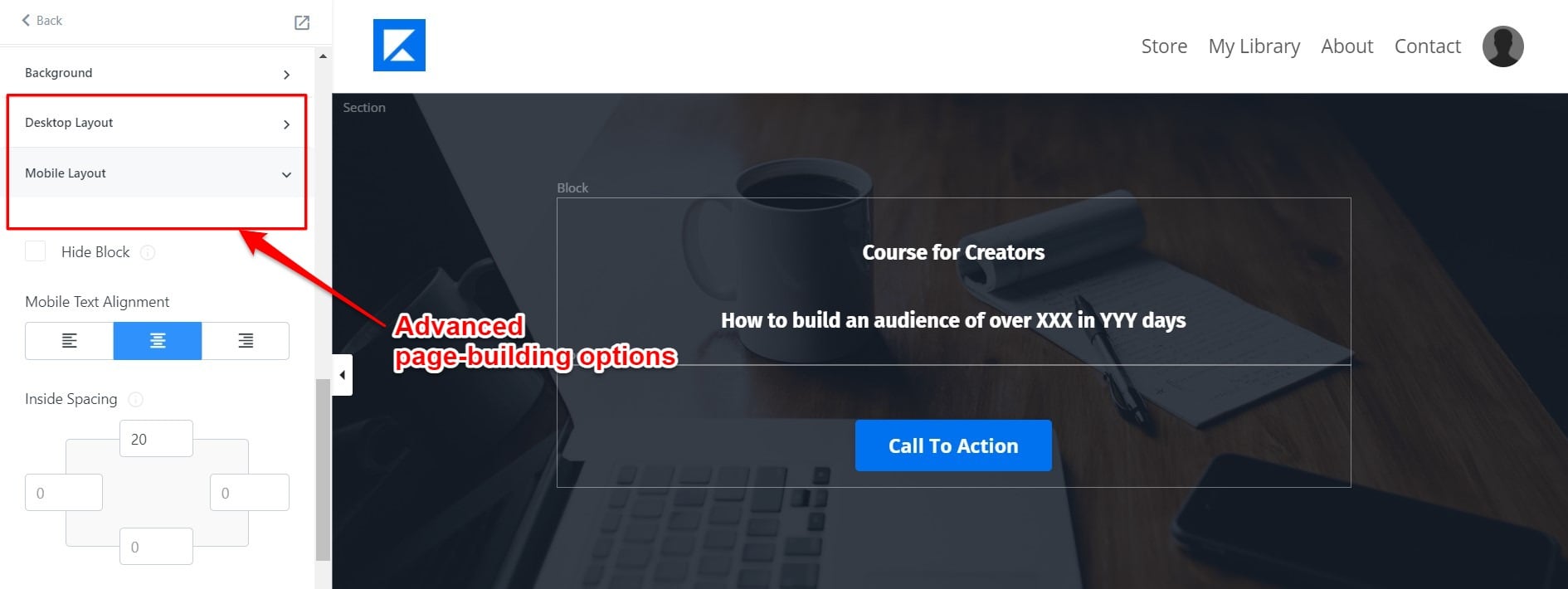 Kajabi has eight themes you can choose from. There are also six other themes available — but the Kajabi team does not work on improving them anymore. Kajabi offers you a lot of editing options: you can choose to customize each page, check how it looks on mobile, create animations, and design your own layouts.