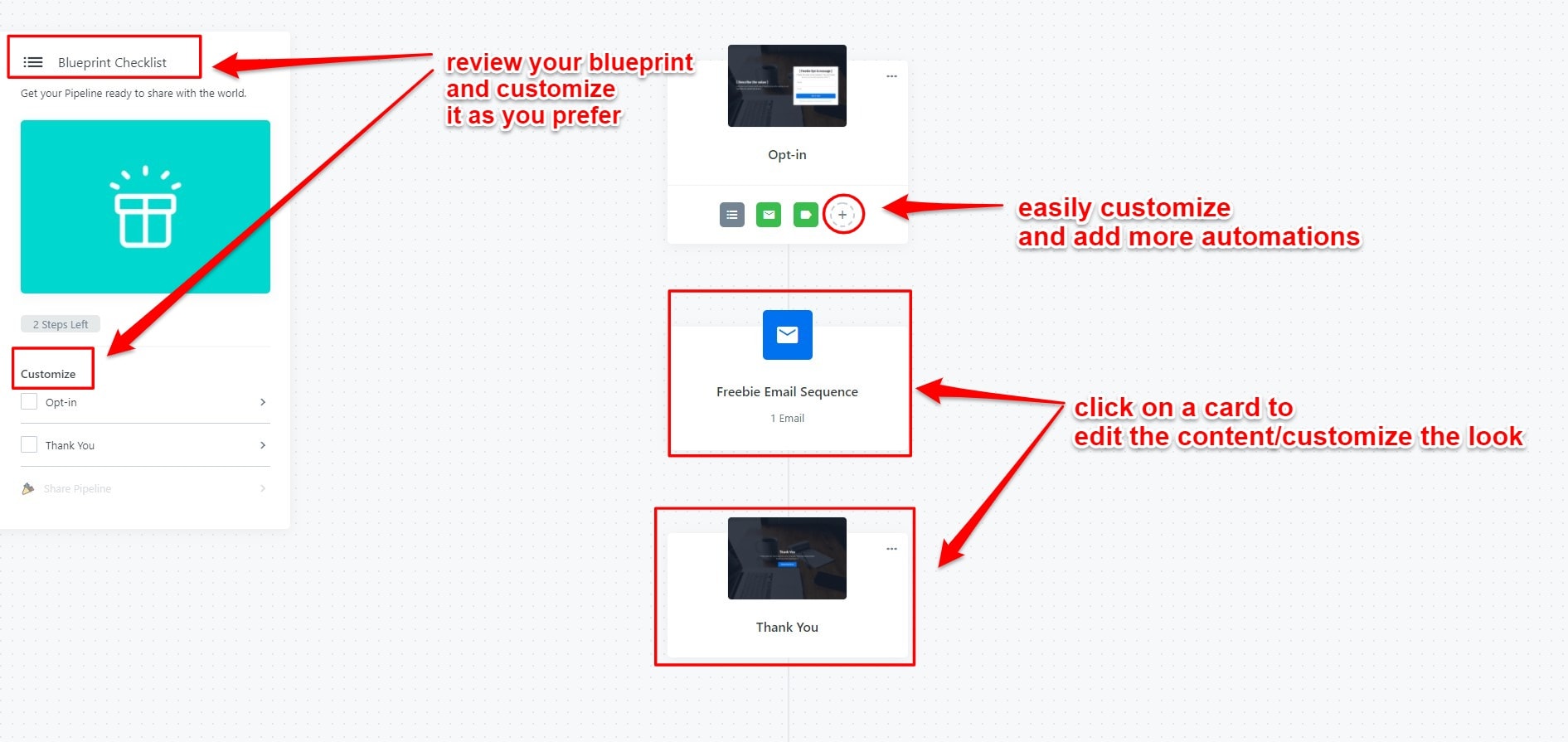 Kajabi has a solid sales pipeline builder. You can create many different types of marketing funnels with just a few simple clicks. There are several blueprints available for landing pages, email campaigns, etc. that can be customized.