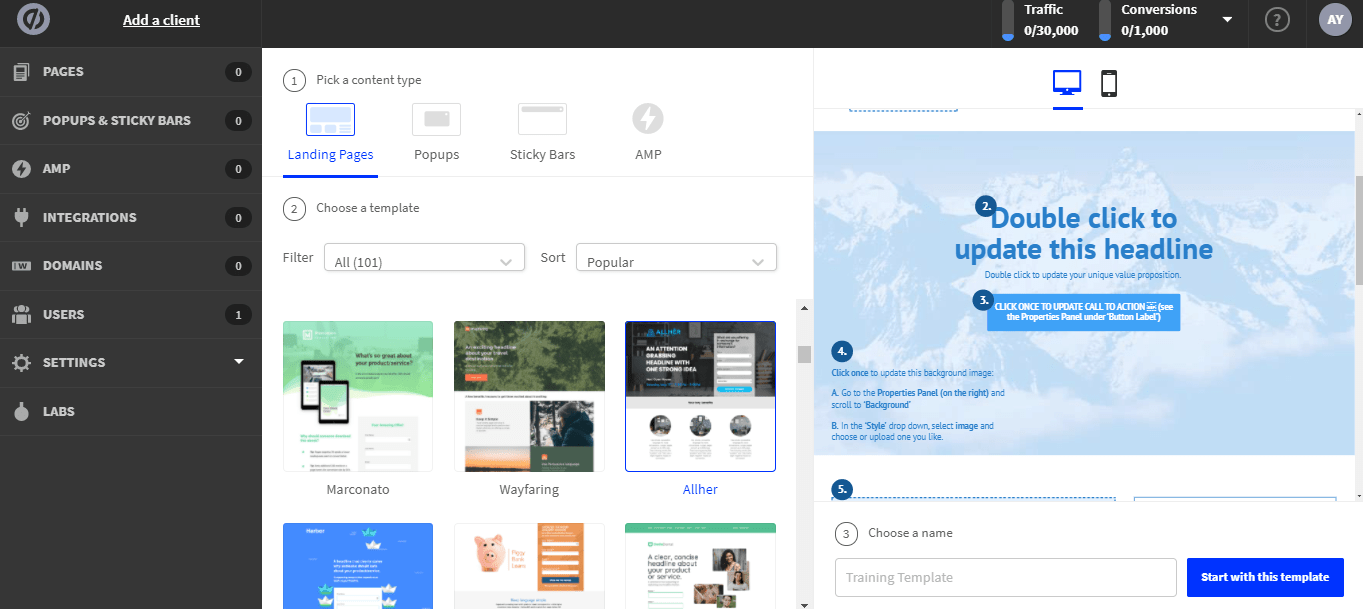 Pricing: There’s a two-week free trial that requires credit card details to sign-up. It has a three-tiered pricing plan starting at $79/month, billed annually with 75 landing pages, eight popups, and sticky bars.