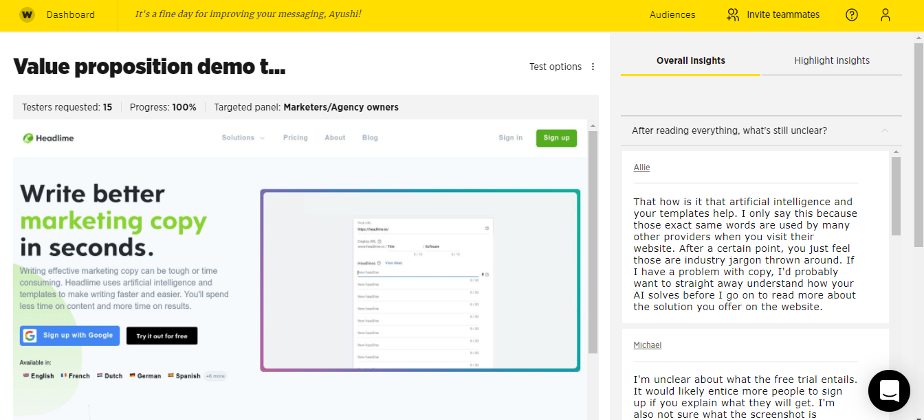 Pricing: It costs $99 per value proposition test and $249 for a full-page message test.