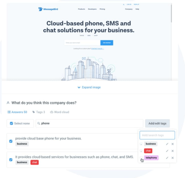 By using the First Click test feature, it’s possible to assess the effectiveness of the links and content hierarchy by measuring how people complete your tasks by using your designs. It’s also possible to tag open text to analyze and identify common themes in your data.