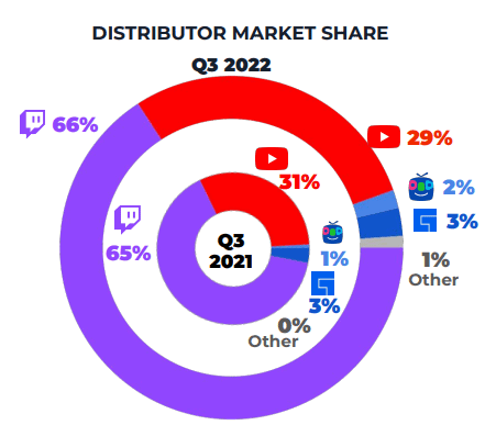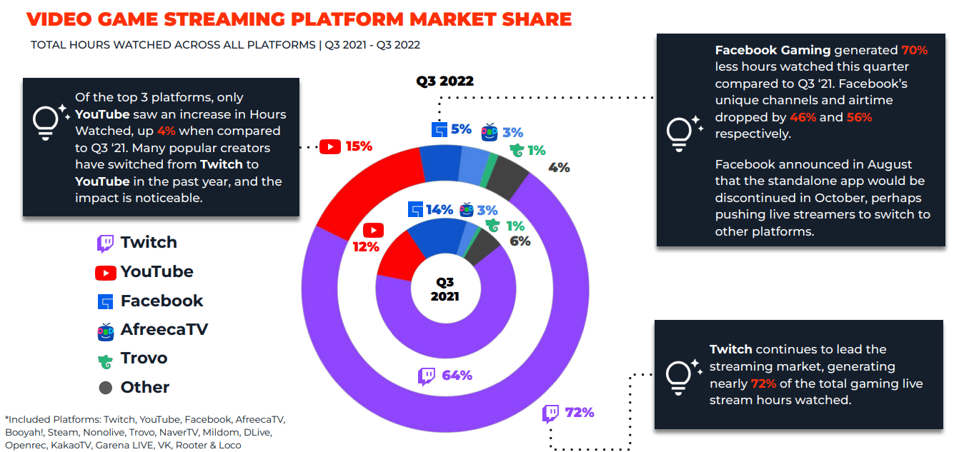1. Twitch is the largest video game streaming platform, with a 72% market share as of Q3 2022. (Stream Hatchet)