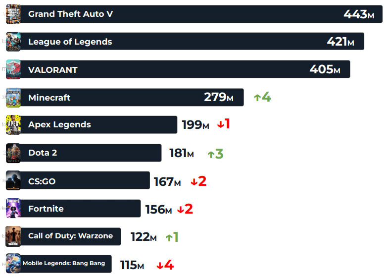 4. GTA V remains the most popular game streamed as of Q3 2022, watched for over 443 million hours. (Stream Hatchet)