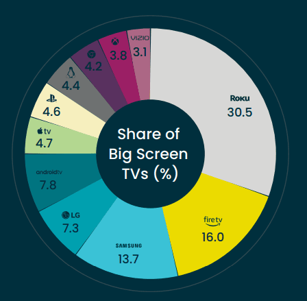 4. Roku continues to be the most popular video streaming app, with about 30.5% market share. (Conviva)