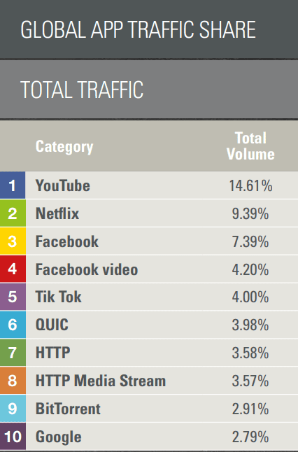 6. YouTube, Netflix, and Facebook video streaming were the top 3 platforms on which video was streamed in 2021. (Sandvine)