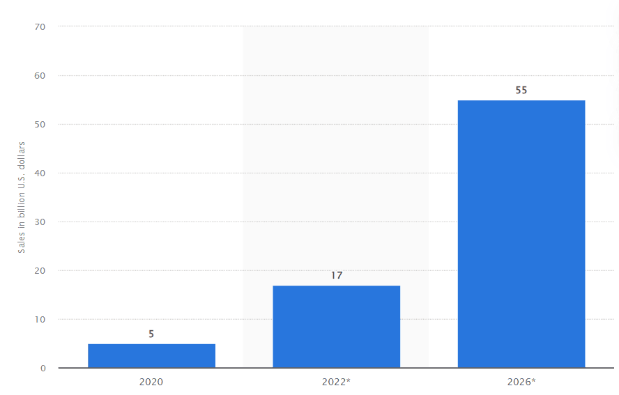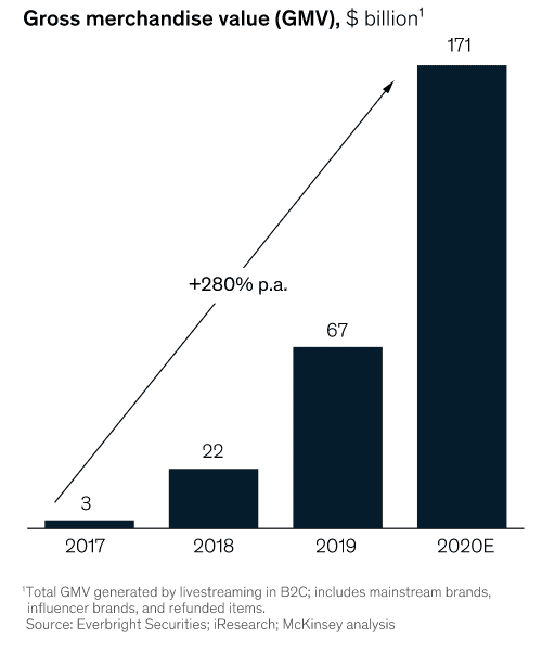 8. The value of China’s live-commerce market grew at a compound annual growth rate (CAGR) of more than 280 percent between 2017 and 2020 and was expected to reach an estimated $171 billion in 2020. This can be an indicator of how the US market will perform. (McKinsey)