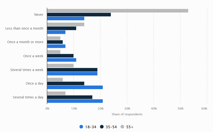 2. YouTube Live and Instagram had a higher usage among live online viewers aged between 18 and 34 years, while users aged between 35 and 54 preferred Facebook Live. (Statista)