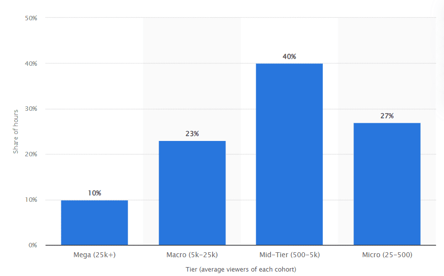 2. Mid-tier influencers captured 40% of all live streaming hours in the leading streaming platforms. (Statista)
