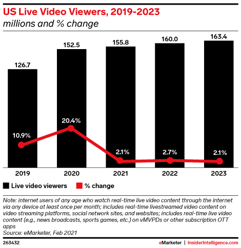 3. According to a forecast by Insider Intelligence, 163.4 million people will be watching lives streams in the US by 2023. (Insider Intelligence)