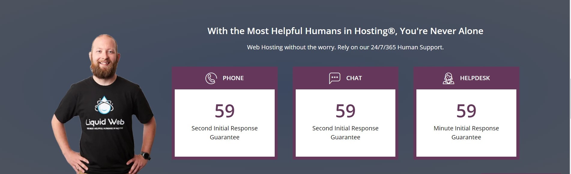 - Expert support 24/7 with a “59” guarantee: Liquid Web offers premium support available to you 24/7 via chat, helpdesk, or phone throughout the year. They have a 59-second initial response guarantee on all their support channels—elevating the customer experience.